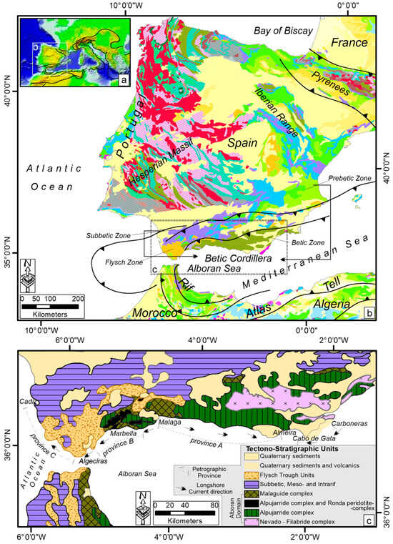 (a) Location map of the Iberian Peninsula and northwestern part of Africa; (b) geological map of the Iberian and northwestern sector of Africa modified after []; (c) tectono-stratigraphic map of southwestern Spain (Betic Cordillera) and northwestern sector of Morocco. The legend of the geological map of panel (a) is shown in Supplementary Figure S1 [].