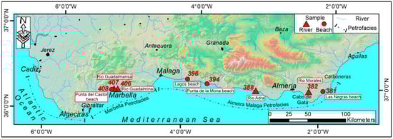 The elevation of the Betic Cordillera ranges from sea-level to 3478 m, with the higher altitude corresponding to Mount Mulhacen. The northeast-to-southwest segment of the chain includes a nearly continuous alignment of highlands nearly parallel to the coastline []. The drainage of the chain is to the northwest and the south, and the drainage network consists of local and ephemeral drainages (Figure 2), generally less than 50 km in length, delivering clastic supply to the coast. These streams produce occasional catastrophic floods, transporting rapid sediment to the coast and distributing drift currents along the shore. An inverse relationship has been found between sediment discharge and the extent of the drainage basins due to the capacity of the rivers to react to sudden floods and the absence of areas in the drainage basins where sediments could be stored (e.g., []). Currently, the climate along the coast varies from semiarid to desert [], becoming more arid eastward, with a mean annual precipitation of less than 200 mm, and more humid westward, with a value of nearly 1000 mm. The mean annual temperature isotherm along the coast averages at 18 °C []. According to these climatic parameters, the weathering efficiency is mainly controlled by mechanical erosion. []. Consequently, the sand composition may accurately reflect parent rock compositions of the source region without the depletion of unstable minerals in sediments (e.g., []). Littoral drift redistributes sediments on narrow, steep beaches, and storm waves can activate a very active surf zone, inducing powerful littoral drift in both the eastern and western directions (e.g., []). Specifically, a prevailing eastward littoral drift predominates between Malaga and Almeria, whereas a westward littoral drift characterizes the coastal stretch from Malaga to Cadiz (Figure 1c) []. Not all the continental clastic supply remains on the shelf because the narrowness of the northern Alboran continental shelf likely favors a quick transfer to deeper sedimentary environments (e.g., []).
