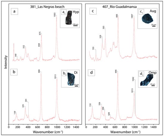 Raman spectra of pyroxene in the Almeria–Malaga petrofacies. (a) Hypersthene (Hyp) and (b) diopside (Di) in Las Negras beach; (c) Augite (Aug) and (d) omphacite (Omp) occurring in Rio Guadalmansa.