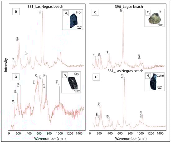 Raman spectra of amphibole in the Almeria–Malaga petrofacies. (a) Hornblende (Hbl) and (b) kaersutite (Krs) detected in Las Negras beach; (c) tremolite (Tr) occurring in the Lagos beach; (d) cummingtonite (Omp) identified in Las Negras beach.
