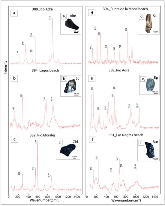 Raman spectra of heavy minerals detected in Almeria–Malaga petrofacies. (a) Garnets such as almandine (Alm) identified in Rio Adra, (b) staurolite (St) detected in Lagos beach; (c) chloritoid (Cld) occurring in Rio Morales; (d) sillimanite (Sil) identified in Punta de la Mona beach; (e) epidote (Ep) identified in Rio Adra; (f) tourmaline detected as buergerite (Bur) in Las Negras beach.
