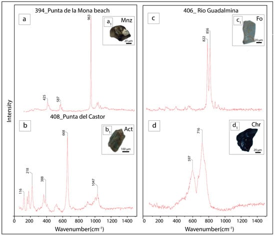 Raman spectra of heavy minerals in Almeria–Malaga and Marbella petrofacies, respectively. (a) Monazite (Mnz) in Punta del la Mona beach; (b) actinolite (Act) detected in Punta del Castor; (c) forsterite-type (Fo) olivine and (d) chromite (Chr) in Rio Guadalmina.