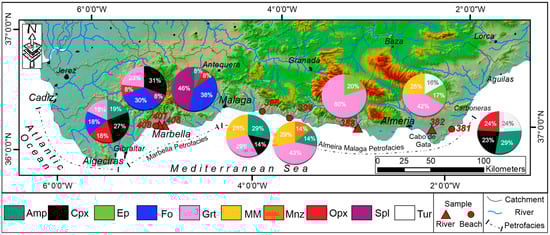 The river (Rio Guadalmansa) to beach environment transition (Punta del Castor) shows a slight decrease in abundance, ranging from 31% to 27% and 23% to 18%, for diopside, augite, and garnet. Amphiboles is present in higher amounts in Punta del Castor beach (19%) and shows a lower value in the Rio Gualdamina (8%) (Figure 8). Chromite was found in Rio Guadalmina and Rio Guadalmansa (Figure 8).