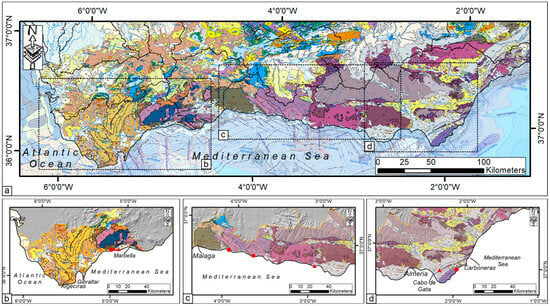 (a) Geological map of the southwestern part of the Betic Cordillera (from []), with the location sites (black rectangles and square); (b) 2D map view of the lithology of Marbella study area with the location sites; (c) 2D map view of the lithology of Malaga study area with the location sites; (d) 2D map view of the lithology of Almeria site with the location sites. The legend of this map is shown in the Supplementary Figure S2 [].