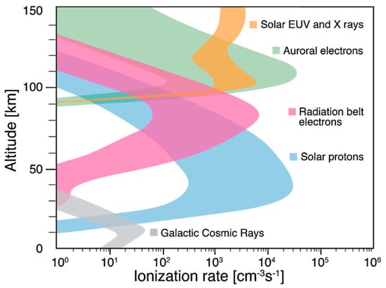 Air ionization is one of the main processes in the whole near-Earth environment because, from most distant areas of the magnetosphere up to the lower boundary of the atmosphere, we encounter ions which are the result of ionization. We can divide the sources of ionization of the atmosphere into three groups: solar electromagnetic radiation and solar wind energetic particle fluxes, galactic cosmic rays, and natural Earth radioactivity. Different altitude levels of the atmosphere are subjected to the action of different sources of solar activity and galactic cosmic rays, see Figure 1 [29].