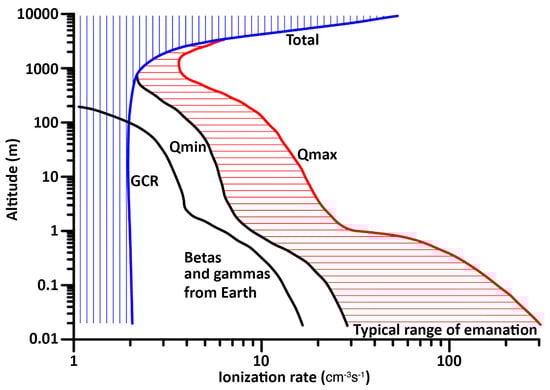 Vertical profiles of air ionization from the ground surface up to 10 km altitude. Blue hatching—galactic cosmic rays; red hatching—ground radioactivity (modified from [30]).
