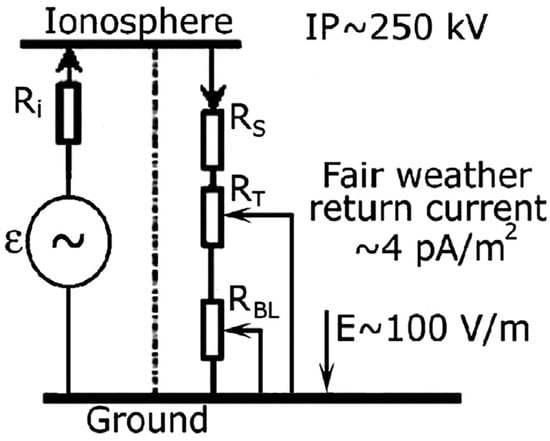 Looking at the figure, we can conclude that the main source of air ionization near the ground surface is the natural radioactivity to which the main contribution is provided by radon [31] up to the nearly 2 km altitude where ionization effects from GCR start to prevail. To understand what effect produces the ionization in lower layers of the atmosphere, we should introduce one more that is strongly responsible for the atmosphere–ionosphere coupling: it is the Global Electric Circuit (GEC) [32]. It controls the atmospheric electricity including the potential difference between the ground surface and ionosphere and, consequently, the vertical electric current. The potential difference is created by the convective air movements and global thunderstorm activity and is of the order 250–400 kV, where the ionosphere is a positive plate and the ground surface is a negative one. In fair weather areas, the electric current is directed down, while in the area of thunderstorm activity, it is in the opposite direction. The authors of [33] analyzed the variations in the ionospheric potential (IP) due to large-scale radioactivity enhancement during nuclear tests in the atmosphere. Their model calculations demonstrated that the IP 40% increase can be explained by the 46% decrease in thunderstorm cloud conductivity. These numbers will be necessary in our following discussions. The most simplified model of GEC (but quite enough for our considerations) is presented in Figure 3.