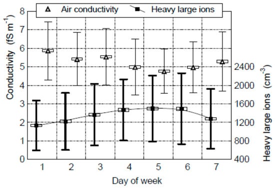 Variation in concentration of heavy ions and air conductivity during a week [47].
