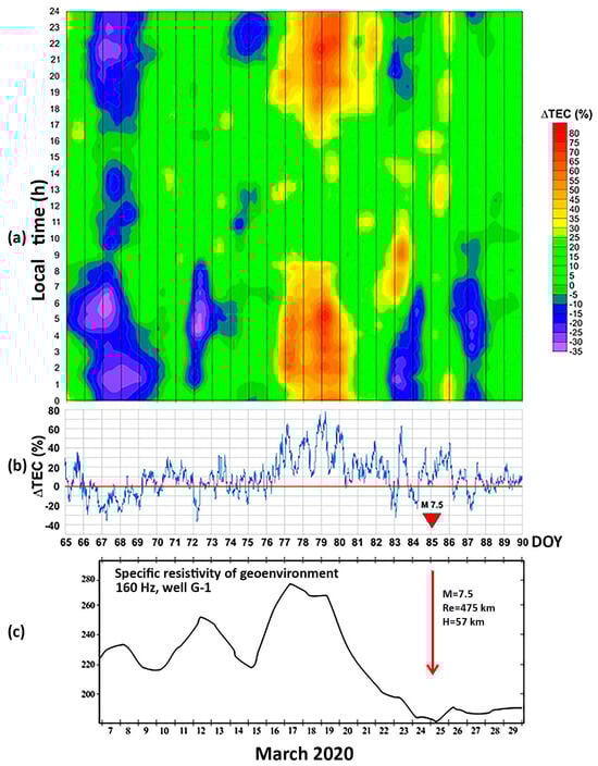 (a) Percental deviation of GPS TEC at Petropavlovsk-Kamchatsky (color coded) versus local time (vertical axis), DOY (horizontal axis); (b) Time series of the DPS TEC percental deviation, a red triangle indicates the moment of the M7.5 earthquake at northern Kurils; (c) Time series of specific resistivity measured by geoacoustic emission in the G-1 deep well on frequency 160 Hz at Petropavlovsk-Kamchatsky, a red arrow indicates the moment of the M7.5 earthquake at northern Kurils.
