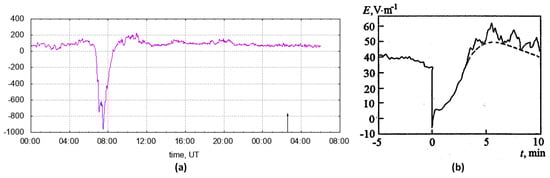 (a) Negative variation in atmospheric electric field 21 h before the M5 earthquake at Kamchatka peninsula on the 24th September 1997 (vertical black arrow indicates the moment of the earthquake [51]); (b) Variation in the vertical electric field around the time of the 20 kT nuclear test in the atmosphere in 1952 [52]. Zero indicates the moment of the explosion. Bold line indicates the electric field variations, dashed line shows the trend of natural value of atmospheric electric field recovering.