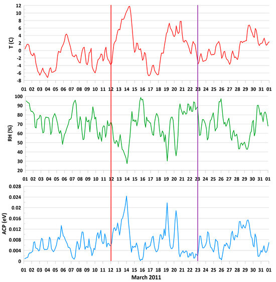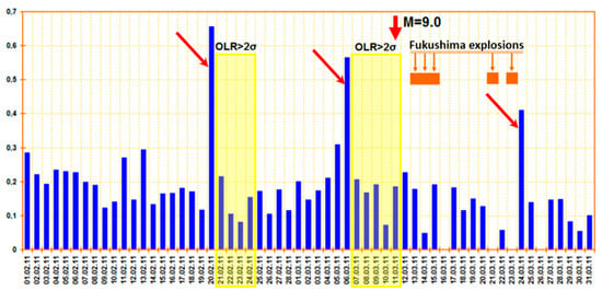 In Figure 11, the daily mean values of ΔfbEs variations are demonstrated for the period from 1 February until the end of March 2011. During this period, we see three extremums of ΔfbEs marked by burgundy arrows. The first two coincide with the start of the period of thermal precursors of the Tohoku earthquake arising in the form of OLR emission, while the third one appears after the series of explosions at Fukushima NPP. This is one more confirmation that the observed effects are connected with air ionization from different sources but with the same physical mechanism and not any external currents proposed in the cited models.