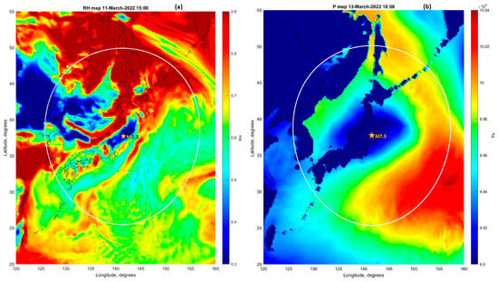 (a) Differential TEC map on 27 January 2011; (b) Differential TEC map on 8 March 2011, 3 days before the M9 Tohoku earthquake. Volcano position and earthquake epicenter are shown by a white cross.