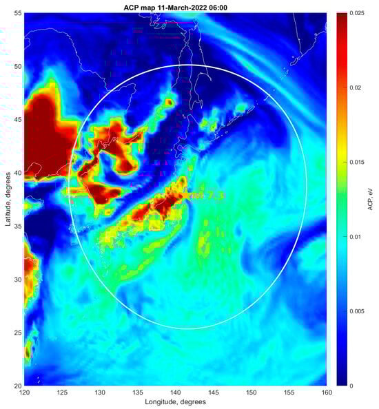 The similarity of two different effects, subionospheric VLF wave propagation and formation of night-time positive irregularity in the ionosphere, both for nuclear power plant accidents and for earthquakes, suggests that they have a similar or identical physical mechanism to be discussed later. We selected the anthropogenic effect for comparison but the same result can be obtained for natural phenomena such as volcano eruptions or dust storms [38,39]. Figure 5a demonstrates the ionospheric effect created by the eruption of the Kirishima volcano in Japan on 26–27 January 2011. Figure 5b demonstrates the positive variations in the ionosphere on 8 March 2011, 3 days before the M9 Tohoku earthquake.