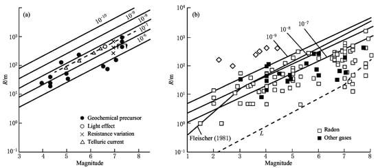 - Dobrovolsky, I.R.; Zubkov, S.I.; Myachkin, V.I. Estimation of the size of earthquake preparation zones. Pure Appl. Geophys. 1979, 117, 1025–1044. [Google Scholar] [CrossRef]