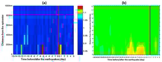 Let us return to the thesis that the mechanism of precursor generation (in our case, pre-seismic variations in the ionosphere) does not differ from other phenomena (natural or anthropogenic) where we deal with processes of air ionization. Following the model calculations for nuclear tests in the atmosphere [33], let us compare such events with the pre-seismic variations in the ionosphere. We do not have experimental data for the nuclear tests but we can use the case of the Chernobyl nuclear power plant explosion in 1986. The authors of [34] observed the anomaly of VLF signal propagation (16 kHz) registered on radio pass Rugby (Great Britain)—Kharkov (Ukraine) during the Chernobyl atomic plant catastrophe. The anomalies were registered both in amplitude and phase of the signal and they were very similar to those that are observed before strong earthquakes when the radio pass of the VLF signal is located over the earthquake preparation zone [35]. Usually, such variations are interpreted as a lowering of the upper boundary of the subionospheric resonator, which is equivalent to the increase in electron concentration in the D-layer [36]. The anomalous variations in the data around the time of the Chernobyl accident were registered even before the reactor explosion, which means that the emanation of radioactive materials started earlier. Both results are supported by the data of vertical ionospheric sounding. The main effect was observed during night-time hours, which corresponds to the formation of an earthquake precursory mask [37]. Figure 4a shows the deviation of critical frequency foF2 from the 15-day median (color coded) registered by Kiev ionosonde in coordinates Days (horizontal axis)—UTC (vertical axis). Figure 4b shows the ionospheric precursor (so-called precursor mask) obtained by the epoch overlay method for 9 earthquakes of M ≥ 5.4 in Italy at a distance of less than 300 km from Rome by the data of the Rome ionosonde. On the horizontal axis, the day’s numeration means days in relation to the earthquake day (minus—before the earthquake; plus—after it).