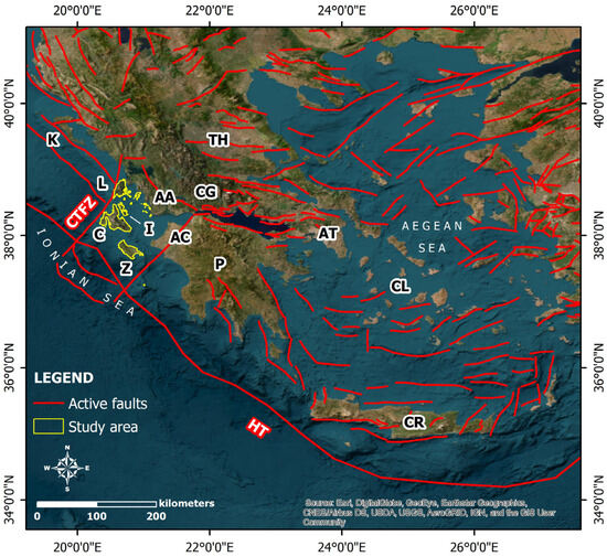 The study area (yellow frame) comprising Lefkada (L), Cephalonia (C), Ithaki (I), and Zakynthos (Z) Islands is located east of the Cephalonia Transform Fault Zone (CTFZ) and a few km away from the Hellenic Trench (HT). K: Kerkyra; AA: Aetoloakarnania; CG: Central Greece; AC: Achaia; P: Peloponnese; TH: Thessaly, AT: Attica; CL: Cyclades Islands; CR: Crete Island. Active faults (red lines) are based on Styron and Pagani [10]. Sources of the basemap: Esri, DigitalGlobe, GeoEye, Earthstar Geographics, CNES/Airbus DS, USDA, USGS, AeroGRID, IGN, and the GIS User Community.