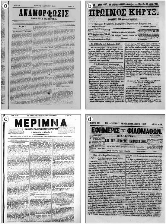 Figure 2. Digitized microfilms of the publicly accessible collection of the Digital Library of the Hellenic Parliament [41] presenting the front covers of the newspapers (a) “Anamorphosis” on 2/14 February 1867, (b) “Proinos Kirix” on 6/18 February 1867, (c) “Merimna” on 7/19 February 1867, and (d) “Ephimeris ton Filomathon” on 20 February/4 March 1867, referring to the 1867 Cephalonia earthquake disaster (dates of Julian calendar/Gregorian calendar). - The Iakovateios Public Central Library—Museum of Lixouri [42]: Thanks to the Typaldos–Iakovatos brothers, the Iakovateios Library houses a remarkable collection of books, ancient artifacts, and religious material, forming one of the Ionian Islands’ richest private libraries. With around 30,000 volumes, the library covers several interests and continues to grow with modern additions.