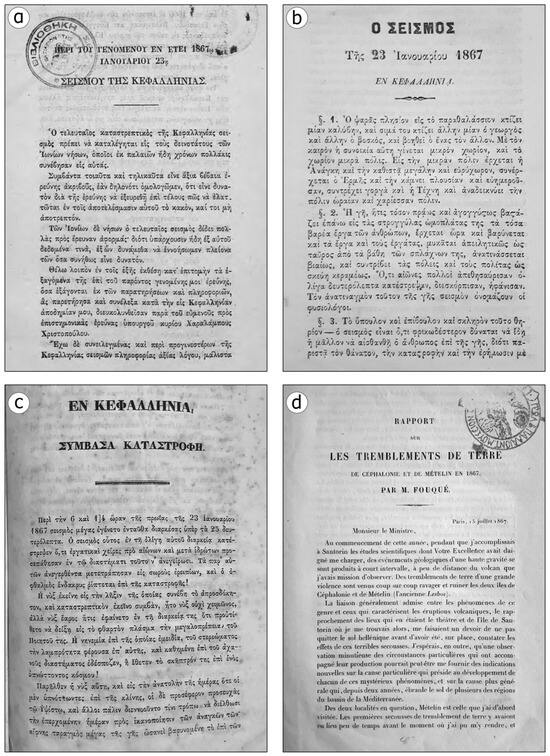 The first pages of the 4 February 1867 Cephalonia earthquake reports by (a) Schmidt [25], (b) Vergotis [29], (c) Solomos [31], and Fouqué [28].