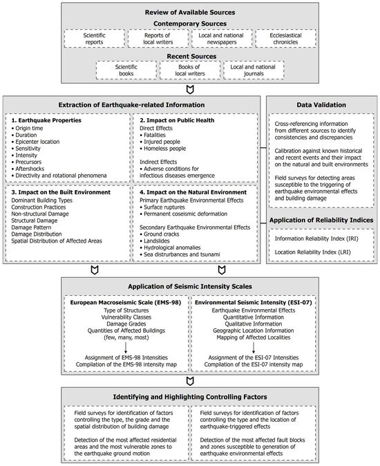 From the presentation of the above research on the historical and the most destructive earthquakes in the Ionian Sea, a gap in seismological and earthquake geology research is noted. This gap can be detected at the end of the 19th century, especially after 1864, a period during which the 1867 earthquake occurred, with hitherto unexplored effects on the natural environment (EEEs), the built environment (buildings and infrastructure), and the local population and its evolution. This gap is filled by the present study, which adopts a methodology that exploits the advantages of research on historical seismicity and the innovations of modern approaches. The methodology is presented in detail in the following chapter.