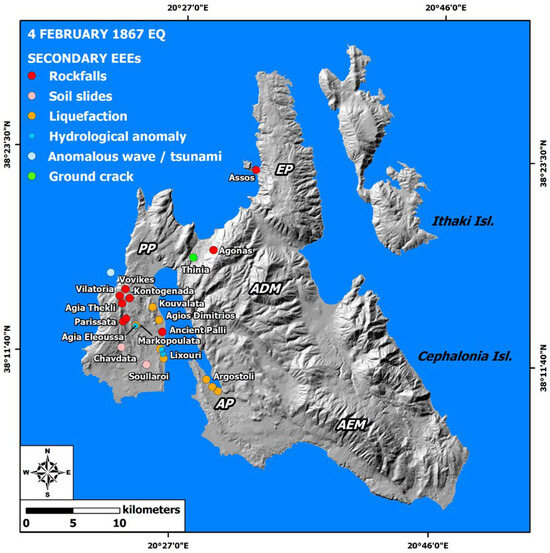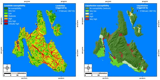 To ascertain the randomness of the distribution of the damage and the environmental effects caused by the 4 February 1867 earthquake, we compared their inventory with published susceptibility maps [4,5] delineating the zones within the central and southern Ionian Islands prone to earthquake-induced hazards (Figure 4).