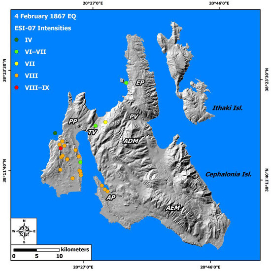 All these sources were reviewed with an emphasis on the impact of the 1867 Ionian Sea earthquake on the local population, the natural and the built environment. Qualitative and quantitative information about the triggered effects was extracted (Figure 4). The damage to buildings in the residential parts of Cephalonia and adjacent areas is presented along with the dominant structural types, their vulnerability classes and the damage grades based on the guidelines of the EMS-98 scale. The environmental effects were classified into primary and secondary, based on the classification presented in the frame of the ESI-07 scale proposed by Michetti et al. [48]. Furthermore, field surveys were carried out in areas of the central and southern Ionian Islands impacted by the 1867 earthquake to identify the unfavorable characteristics contributing to the triggering of effects. Based on the available information, the EMS-98 and the ESI-07 scales were applied to assess local seismic intensities and the most affected fault blocks in the study area (Figure 4).