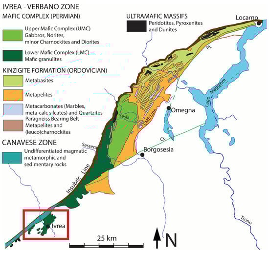 The Ivrea–Verbano Zone (IVZ), located in NW Italy, is a 130 km long and 10–50 km wide strip that extends from Ivrea up to Locarno (Figure 1). The IVZ belongs to the Southalpine domain of the Alps, i.e., the domain consisting of Variscan continental crust and constituting the Adria plate during the Triassic–Jurassic extensional tectonics responsible for the opening of the Tethys Ocean [15,45,46]. This domain, also known as the Southern Alps, was only marginally involved in the compressional tectonics responsible for the Tethys closure and continental collision generating the Alpine chain, and, so, it records a low-grade Alpine metamorphism that is traced only along tectonic structures [14], and references therein]. To the SE, the IVZ is separated from the Serie dei Laghi sequence (Southalpine Variscan mid-to-upper crust section) by the Permian transpressional shear zone of Cossato-Mergozzo-Brissago and by the subsequent Pogallo and Cremosina Lines. To the NW, a thick (1 km wide) mylonite zone called the Insubric Line (e.g., [47,48,49]) separates the IVZ from the Sesia Zone (i.e., a Variscan continental crust strongly involved in the Alpine tectonics). To the SW, near Ivrea town, a ductile deep fault named the Internal Canavese Line (e.g., [50]) separates the IVZ from the Canavese Zone, a Variscan continental crust recording a very low-grade Alpine metamorphism. The IVZ is subdivided into three units: (a) the Kinzigite Formation, (b) the Mafic Complex, and (c) the Ultramafic Massifs (Figure 1).