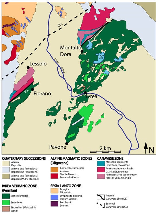 Well-preserved lower crust sections rarely outcrop (e.g., [5,6,7,8,9,10] and references therein). The Ivrea–Verbano Zone IVZ in northern Italy is a promising site to study the melt–rock interaction in the lower crust and its potential geodynamic consequences. It is one of the best-preserved middle- to lower-continental crustal sections in the world, in which distinct mafic magmatic pulses infiltrated a Variscan lower crust during the Permian orogenic collapse (e.g., [11,12,13]), and in which different geological evidence of the Mesozoic Alpine rifting are preserved [e.g., [14,15,16,17], and references therein]. The IVZ is subdivided into the northern (Finero Complex), central (Strona, Sesia and Sessera valleys), and southern (Ivrea and Baldissero) IVZ. Previous studies concentrated on the northern (e.g., [18,19,20,21,22,23,24,25,26,27]) and central IVZ [28,29,30,31,32,33,34,35,36,37,38,39,40,41,42,43], and references therein]. To our knowledge, the only recent paper on the southern IVZ is by Mazzucchelli et al. [44] on the Baldissero peridotites, whereas the mafic rocks outcropping in and around the Ivrea town have never been studied in detail.