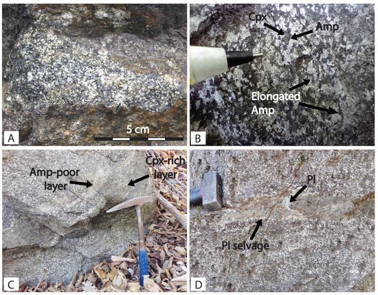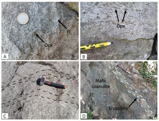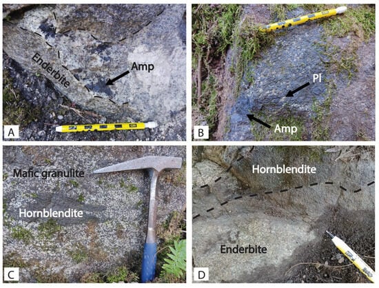The mafic granulites macroscopically exhibit an apparent homogenous texture and composition ranging from gabbronorite to amphibole gabbronorite (Amp–gabbronorite). However, a detailed examination revealed local variations in grain size (from medium- to coarse-grained; Figure 3A,B), in texture (from granoblastic to faintly foliated; Figure 3A,B), and in modal composition (variation in Pl and Amp contents, Figure 3C). Locally, the mafic granulites exhibit 0.5–5 cm-wide pyroxene-rich layers showing infiltrating plagioclase (Pl) from the selvages, and fractures filled by infiltrated coarse-grained Pl + Amp (Figure 3C,D). The mafic granulites are crosscut by enderbites and Amp-rich dykes (see below).