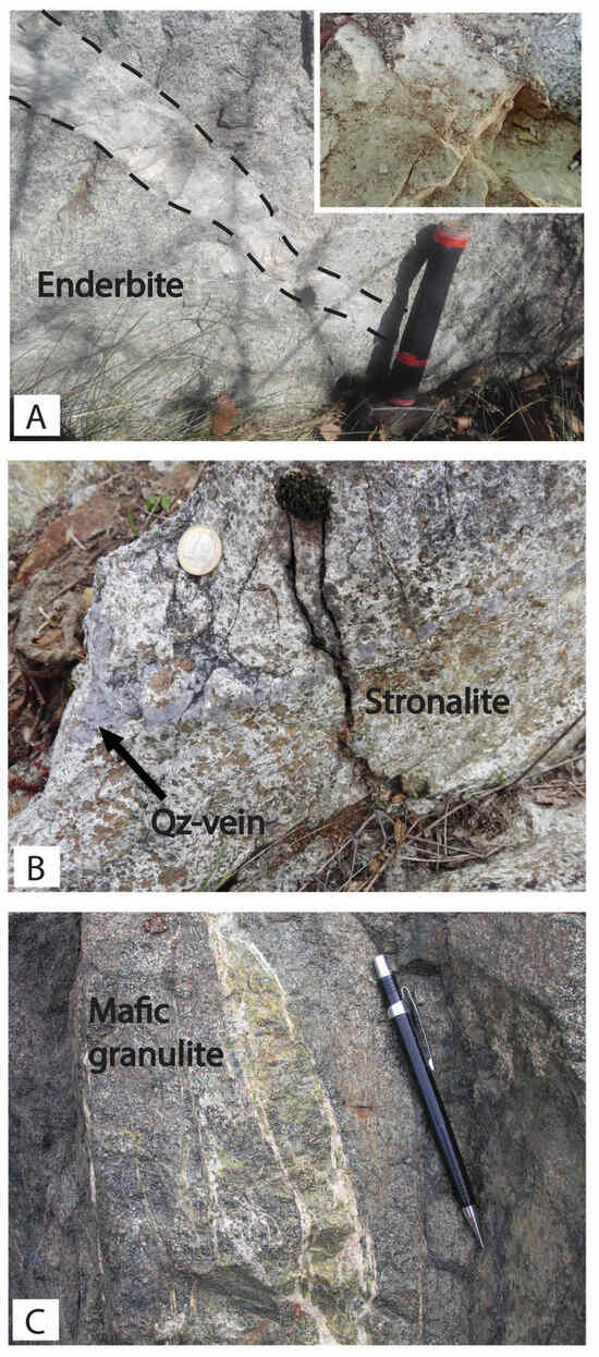 The stronalites are rare and outcrop in the central part of the studied area (Figure 2). They constitute a few ‘septa’ (i.e., thin, lensoidal bodies that can be traced for a rather long distance) up to 100 m long and 20–50 m wide. The septa appear oriented ca. NE–SW (Figure 2), i.e., parallel to the main strike observed in other localities of the IVZ (Figure 1). The stronalites are usually intercalated between enderbites and mafic granulites, however, their contact is not visible. The stronalites exhibit partial melting structures, such as leucosome formation, melt segregation, and the formation of coarse-grained quartz veins (Figure 6B). The quartz veins commonly have an amethyst-like color, due to numerous inclusions of rutile needles. The coarse-grained stronalites contain garnet porphyroblasts up to 1 cm in diameter (Figure 6B), while the fine-grained varieties contain plagioclase and garnet < 0.5 mm in diameter. Plagioclase and sillimanite, both fibrolitic and prismatic, are abundant, but very minor K-feldspar and biotite are also observed. The stronalites are usually not well preserved and show extended plagioclase alterations and retrograde quartz + scapolite or quartz + (clino)zoisite veins. Further investigation of the stronalitic septa is beyond the scope of this work.
