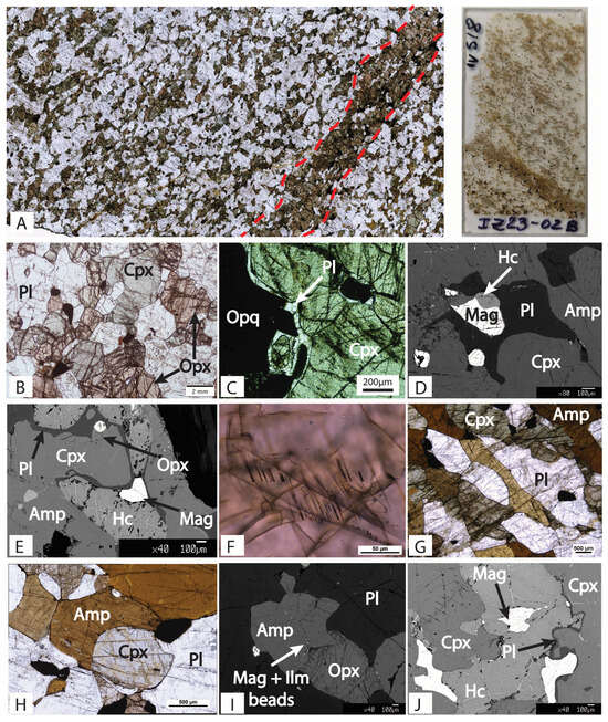 The Mag is usually associated with pyroxenes and constitutes allotriomorphic or polygonal crystals (Figure 7J), depending on the rocks’ structure. It appears as blebs inside composite crystals with deep green Hc, partially surrounded by interstitial Pl (Figure 7J).
