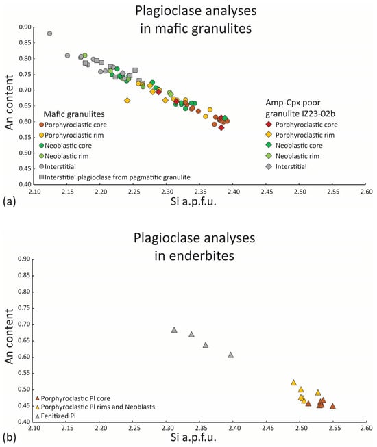 Two generations of Pl and pyroxenes (Px) can be easily distinguished. The first one consists of coarse-grained (2–9 mm) porphyroclasts of Pl, Opx, and Cpx with lobate grain boundaries, while the second one consists of medium- to fine-grained neoblasts with a granoblastic polygonal structure (Figure 7B). The cores of porphyroclastic Pl include apatite (Ap) and Px and are the richest in Na (An = 0.59–0.65; Figure 8a), although the composition varies from one sample to another. The Pl neoblasts and the rims of the porphyroclasts are almost devoid of mineral inclusions, and their composition is always slightly higher in Ca with respect to the corresponding porphyroclastic cores (An = 0.64–0.67; Figure 8a). Another Pl generation constitutes μm-wide interstitial films between Cpx and Mag ± Hc (Figure 7C–E) and, very rarely, between Opx and Mag ± Hc, but not between Amp and Mag ± Hc (Figure 7E). The composition of this generation is the highest in Ca and shows a large An spread (An = 0.76–0.88; Figure 8a). In sample IZ21-20a (foliated mafic granulite), the Pl neoblasts show a chemical re-equilibration towards the more calcic compositions of the interstitial Pl (Figure 8a).