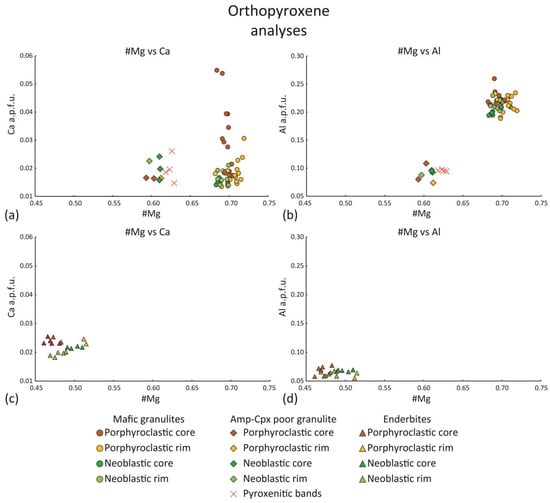 Orthopyroxene chemical composition in mafic granulite and Amp–Cpx-poor granulite (a,b) and in enderbite (c,d).