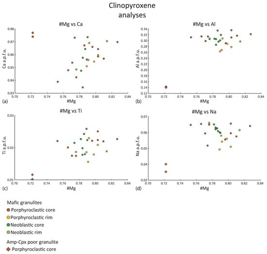 Clinopyroxene chemical composition in mafic granulite and Amp–Cpx-poor granulite. Correlation of the #Mg with (a) Ca a.p.f.u., (b) Al a.p.f.u., (c) Ti a.p.f.u., and (d) Na a.p.f.u.