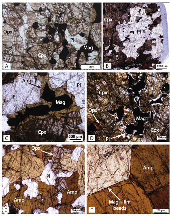 Px-rich layers and Amp-rich dykes and pods under a microscope. (A) Typical Px-rich layer consisting of Cpx + Opx + Opq + Pl and showing a granoblastic structure with lobate grain-boundaries, usually evolving toward polygonal ones. Sample IZ23-02b, PPL. (B) Coarse-grained Pl and minor Amp cutting and infiltrating a Px-rich layer (for a macroscopic view, see Figure 3D above). Sample IZ21-15a, PPL. (C) Interstitial Amp surrounding Mag from a Px-rich layer. Sample IZ21-15a, PPL. (D) Interstitial Pl at the contact between Mag and Cpx from a Px-rich layer. Sample IZ21-15a, PPL. (E) Pegmatitic Amp from an Amp-rich pod (for a macroscopic view, see Figure 5B above) partly replacing Opx of a mafic granulite. Sample IZ21-17, PPL. (F) Pegmatitic polygonal Amp, from an Amp-rich pod, with opaque “beads” at the Amp–Amp grain boundaries. Sample IZ21-17, PPL.