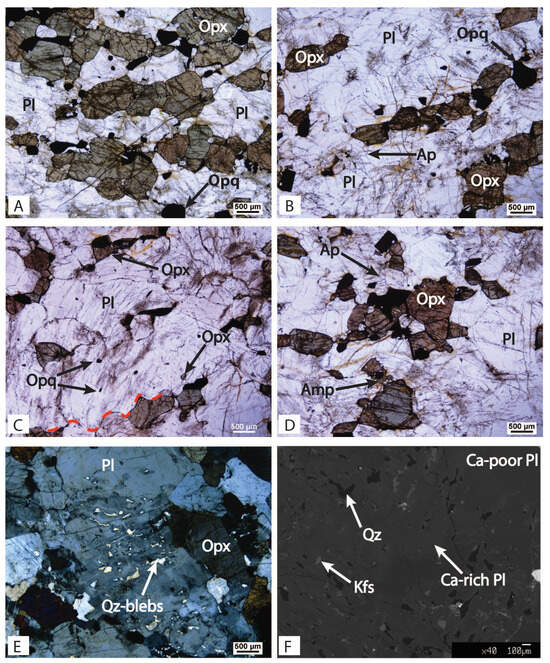Enderbites under the microscope. (A,B) Enderbite showing a faint foliation defined by a dimensionally oriented porphyroclastic, exsolution-rich Opx (A), or by an elongated aggregate of neoblastic, exsolution-free Opx (B). Sample IZ21-04a, PPL. (C) Porphyroclastic Pl showing lobate grain-boundaries (red-dashed line) with exsolution-rich Opx. Sample IZ21-01, PPL. (D) Neoblastic Opx and Pl showing polygonal granoblastic microstructure. Note the rare green–brown Amp around Opq. Sample IZ21-04a, PPL. (E) Pl showing Qz blebs in their interior and at their grain boundaries. Note a change in Pl composition around the blebs. Sample IZ21-02, crossed polarized light (XPL). (F) Qz blebs associated with replacement antiperthitic Kfs and with an increase in anorthite component of the hosting Pl. Sample IZ21-01, BSE.