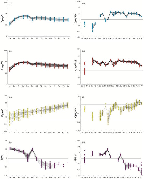 Rare Earth Element (REE) and incompatible trace element patterns of the most abundant minerals in the studied mafic granulites of Ivrea town area: (a,b) clinopyroxene; (c,d) amphibole; (e,f) orthopyroxene and (g,h) plagioclase. The plots show individual analyses for each mineral. Primitive mantle and CI–chondrite values are from McDonough and Sun [80].