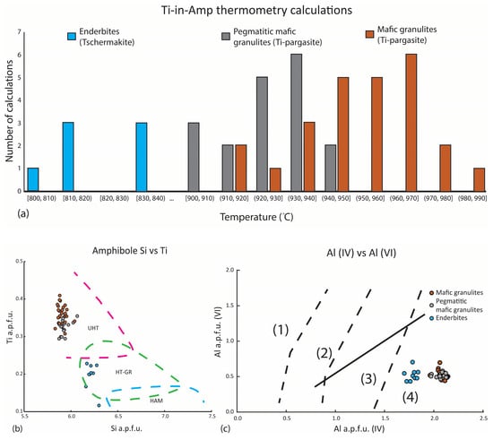We used amphibole as a geothermobarometer because it is a sensitive mineral to both T and P changes. The recent Ti-in-Amp thermometer ([81]; standard error of the calculation, 1σ, ±35 °C and 2σ ±70 °C [82]) was applied to the mafic granulites as well as the pegmatitic mafic rocks and enderbites (Table S1) because the chemical disequilibrium among the minerals (see discussion) prevents the use of most classical geothermometers (e.g., Amp–Pl thermometer) and makes the use of phase equilibrium modeling questionable [83]. The calculated data indicate T > 900 °C with a peak at 965 °C for the mafic granulites, T > 900 °C with a peak at 933 °C for the pegmatitic mafic rocks, and T < 840 °C with a peak at 810 °C for the enderbites (Figure 15a). Note that the T variation between the mafic granulites and pegmatitic rocks is within the standard error of the calculation. The Si vs. Ti distribution for mafic granulites and pegmatites corresponds to that of UHT granulites, whereas that for enderbites is within the HT field (Figure 15b). Regarding the pressure, the AlIV vs. AlVI distribution is compatible with medium-P granulites (Figure 15c) for all the studied lithologies.