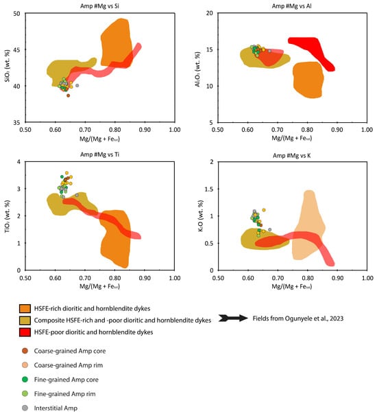 The Px-rich layers are medium- to very coarse-grained and consist of Opx, Cpx, and variable amounts of Mag, Ilm, and Pl (Figure 12A). The layers exhibit a granoblastic structure; however, the parent magmatic structure is still commonly preserved. Both Cpx and Opx show exsolution lamellae and opaque minerals show interstitial or polygonal habit. Opx from the pyroxenitic layer of sample IZ23-02b has a relatively homogeneous composition with Mg# = 0.62–0.63, Ca content ranging from 0.015 to 0.026 a.p.f.u., and Al content less than 0.1 a.p.f.u. (Figure 9a,b). The associated Pl in the pyroxenitic layers has an anorthite content ranging from 0.62 to 0.66, while interstitial Pl reaches An = 0.75. Locally, the layers are infiltrated by coarse-grained brown Amp + Pl (Figure 12B) that exhibit the interstitial structures already described for the mafic granulites (Figure 12C,D). These structures are well preserved in the samples that correspond to the coarse-grained Amp-rich elongated bodies, pods, or lenses, locally pegmatitic, that infiltrate both mafic granulites and Px-rich layers. These lithologies show increased proportions in brown Amp and/or Pl (Figure 12E) and usually exhibit interstitial or granoblastic structures. In particular, the Amp–Amp triple joints are marked by the Ilm ± Mag “beads” already described for the mafic granulites (Figure 12F). The interstitial Pl is Ca-rich (An = 0.72–0.79), like the interstitial Pl within the mafic granulites (Figure 8a). Interstitial Amp and neoblasts have overlapping compositions of a Ti-rich pargasite characterized by Mg# = 0.67–0.72, and (in a.p.f.u.) Ca = 1.73–1.82, Mn = 0.02–0.03, Al = 2.49–2.67, K = 0.17–0.22, Na = 0.74–0.84, Ti = 0.30–0.36, and Cl = 0.01–0.02; F ≤ 0.10 (Figure 11). These compositions are similar to those of the Amp from mafic granulites, but are characterized by slightly higher K and lower Ti contents (Figure 11).