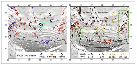 - Nemati, M. Seismotectonic and seismicity of Makran, a bimodal subduction zone, SE Iran. J. Asian Earth Sci. 2019, 169, 139–161. [Google Scholar] [CrossRef]