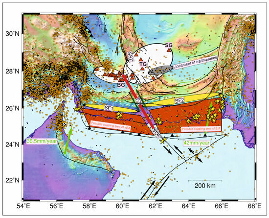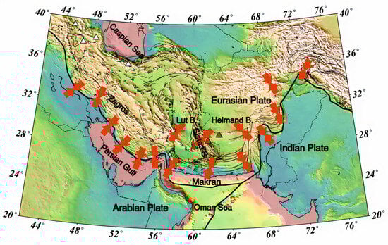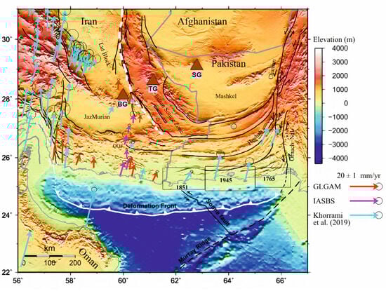 - Ghadimi, H.; Khodaverdian, A.; Zafarani, H. Active deformation in the Makran region using geological, geodetic and stress direction data sets. Geophys. J. Int. 2023, 235, 2556–2580. [Google Scholar] [CrossRef]