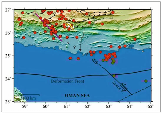 - Akbarzadeh Aghdam, M.; Ghods, A.; Sobouti, F.; Motaghi, K.; Priestley, K.; Enayat, M. Seismicity around the boundary between eastern and western Makran. J. Asian Earth Sci. 2024, 259, 105926. [Google Scholar] [CrossRef]