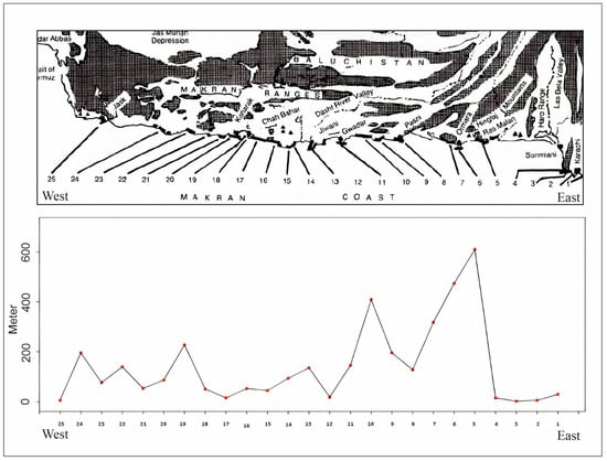 - Snead, R.J. Uplifted marine terraces along the Makran coast of Pakistan and Iran. In Himalaya to the theSea; Routledge: London, UK, 1993; pp. 225–246. [Google Scholar]