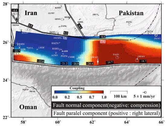 - Frohling, E.; Szeliga, W. GPS constraints on interplate locking within the Makran subduction zone. Geophys. Suppl. Mon. Not. R. Astron. Soc. 2016, 205, 67–76. [Google Scholar] [CrossRef]