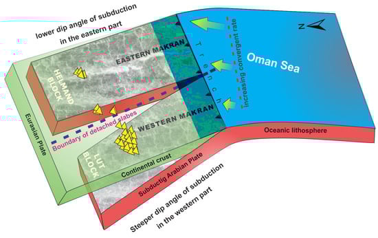 - Mousavi, N.; Ardestani, V.E.; Moosavi, N. Slab extension and normal faulting in a low-angle subduction-related environment: An example of the Makran subduction zone (Iran–Pakistan). J. Asian Earth Sci. 2022, 233, 105244. [Google Scholar] [CrossRef]