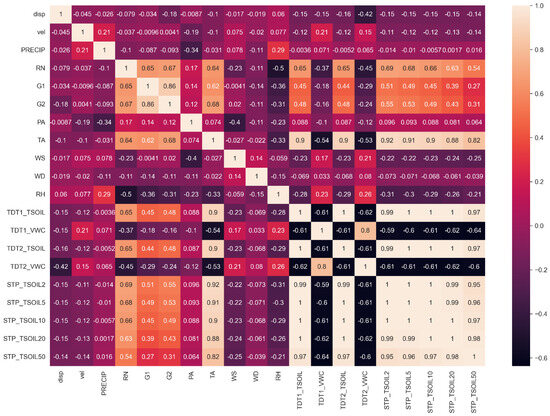 It is worth noting that, firstly, the displacement (disp) and velocity (vel) indicators are only weakly correlated to the influencing factors, hinting that these indicators are functions of multiple influencing factors that should be considered jointly. Secondly, as expected, there are many subsets of highly correlated influencing factors, e.g., all the variables related to temperature or all the variables related to energy (e.g., net radiation and soil heat flux) are highly mutually correlated. Hence, the dimensionality of the influencing factors to be measured could potentially be reduced without losing relevant information. Note that we can identify six distinct, less correlated with others, groups of influencing factors. These are: (1) precipitation, atmospheric pressure, (2) wind speed, (3) wind direction, (4) relative humidity, (5) net radiation, soil heat flux, air temperature and soil temperature and (6) soil moisture.