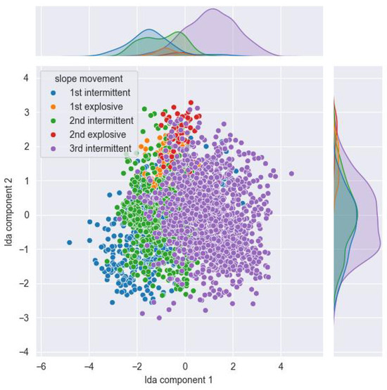 The Hollin Hill failure is a moisture-induced and generally slow-moving landslide with intermediate periods of fast movements. The daily rate of normal movements in this site is within the range [ mmday−1, 3.55 mmday−1], while in periods of major events, movements can accumulate up to 250 mm per event, reaching rates up to 16.68 mmday−1. The approach adopted in this study forms a framework according to which, relative and cumulative movements are predicted through the utilisation of a multiparameter dataset of long-term recordings related to distinct movement patterns. Since it is focused on daily relative displacement, this methodology is more applicable to cases of landslides where failure follows a behaviour dominated by periods of fast and slow movements where those stages can be distinguished. All steps followed across the process, such as dimensionality reduction, feature selection and the identification of subgroups within the recordings in an unsupervised manner but also the prediction of cumulative movements via regression, are generic and suitable for any dataset and type of sensors used, and so can be utilised in landslide early warning systems. It is worth mentioning here that the relative importance of features will be dependent on the specific type of landslide. For example, in the case of slopes with significant vegetation height (high-rise trees), the feature “wind speed” could play a more decisive role compared to our case, while gravitational forces that come from dense vegetation (densely located trees for example) can play a destabilising role in the failure process. In other cases, thawing permafrost triggers the landslide and so features related to temperature should play the most decisive role since the warming effect associated with climate change leads to melting the weakened and highly saturated frozen soil, thus leading to generalised instabilities.