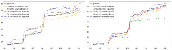 Figure 5 shows the same set of results in terms of cumulative displacement vs. time, that is, the prediction of cumulative displacement over 1-, 5-, 10-, 15- and 30-day periods to verify how well the 3 regression models capture the unseen slope movements visually. As observed in