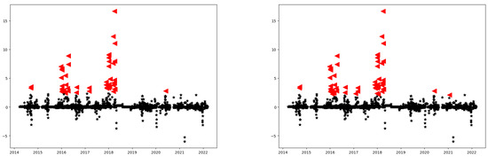−1) vs. time (in days) plot. It can be seen that both methods led to similar clustering results, successfully isolating major explosive failures (red triangles corresponding to the orange cluster in the dendrogram plot) that took place in 2016 and 2018. This suggests that the identified features indeed capture changes in the relative displacement well, with only few outliers that are similarly positioned in both graphs: around late 2014, mid 2020 and, with the RF method, early 2021.