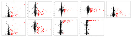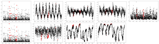 Figure 8 shows the clustering results presented as each of the selected feature vs. time. It can be seen that the areas of explosive failure happened during high peaks in PRECIP. However, there are a number of outliers, which means that PRECIP alone cannot be used as a feature for distinguishing the two types of displacement. Note that parameter RN, i.e., net solar radiation, expresses the total amount of solar energy that comes into the soil, and is generally low between autumn and spring. One can see from