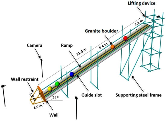 The experiments were conducted using a 11.0 m long and 1.1 m wide rolling ramp (Figure 1). A spherical granite boulder of a 37.5 cm diameter (d) and a 72.925 kg weight (w) was released from different heights, with different levels of initial potential energy. The rolling ramp formed an angle of 21° from the horizontal. A narrower 40 cm wide channel was designed on the ramp to constrain the block trajectory. In this way, the energy is not lost due to lateral impacts, and a central hit on the wall is achieved. The brick walls were placed at the lower end of the channel, orthogonally to the ramp. The ramp intersected the walls at a height of 250 mm, which was also designed in order to achieve a central hit on the wall.